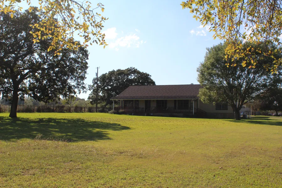 Peaceful Country Charm!! This 3 bedroom, 2 bath pier beam house sets on 10 acres amongst scattered large oak trees. Enjoy the atmosphere on the front or back covered porches, patio areas, swimming pool, or on horseback. The house has a delightful kitchen with granite countertops, large living room with vaulted ceiling, nice bedrooms and a bonus room that could be a office area. Barn has office, work area, and stalls. There are working pens and cross fencing as well.