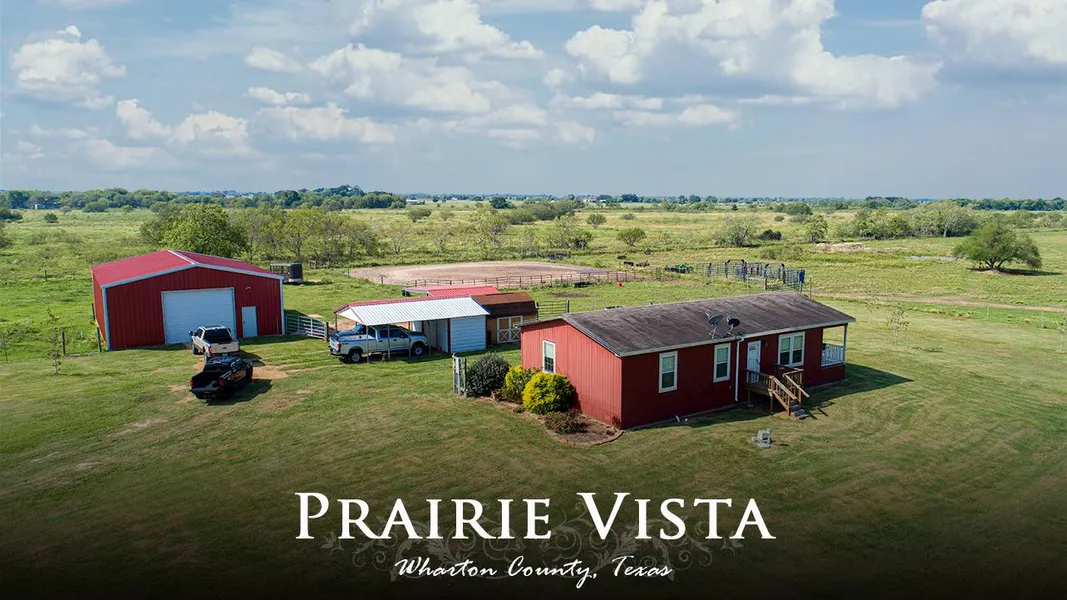 PRAIRIE VISTA: Enjoy the privacy and seclusion of your very own 60-acre ranch located just minutes from El Campo. Featuring a clean 3-bedroom, 2-bath double wide with a great covered back deck. In addition there's a 2000sf metal barn with large rollup doors on each end and a concrete floor. Other storage is available at the end of the two car carport and also a small storage building. Also there's an arena and run in shed for your horses. Check this property out today! It's move-in ready.