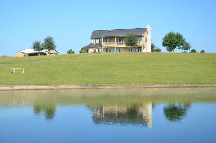 This Well appointed two story commuter home on 10+ acres in the Waller School District overlooks a lovely pond and trees backed by a distant view of the large neighboring ranch. The hilltop view is appreciated form the tall French doors across the back of the house, a long back porch and an upstairs balcony. Artfully decorated with an emphasis on minimal country chic, the first floor features wood floors throughout the living room, dining room, island kitchen, mudroom, half bath and a full suite that could be used as a mother-in-law wing. Upstairs is a large master bedroom, master bath w/soaking tub and oversized shower, two additional bedrooms with a bonus room, another bath, study alcove and utility room. This bright and sunny floor plan offers both incredible outdoor views and the security of privacy. Added is a matching garage/utility building of 1152 sq. ft. consisting of three...