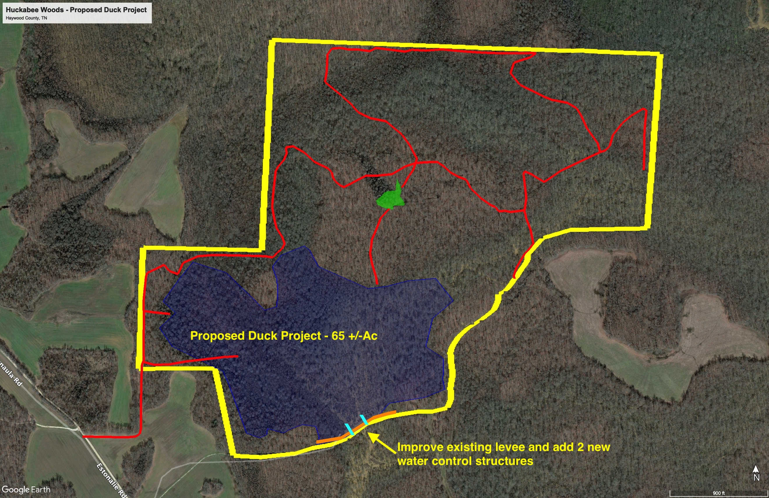 For those interested in waterfowl habitat development, there is potential for seasonal impoundments in a couple locations on the property. To the south, the Huckabee Woods are bordered by a farm road which could potentially be improved with minimal work to act as a levee with water control structures creating a Green Tree Reservoir (GTR). From historical aerial photographs, it appears this GTR could impound 65+/- acres of natural bottomland forest.