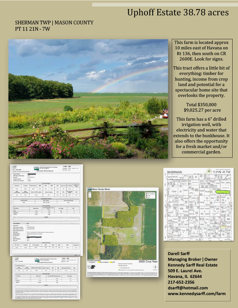 This farm is located approx 10 miles east of Havana on Rt 136, then south on CR 2600E. This tract offers a little bit of everything: timber for hunting, income from crop land and potential for a spectacular home site that overlooks the property.