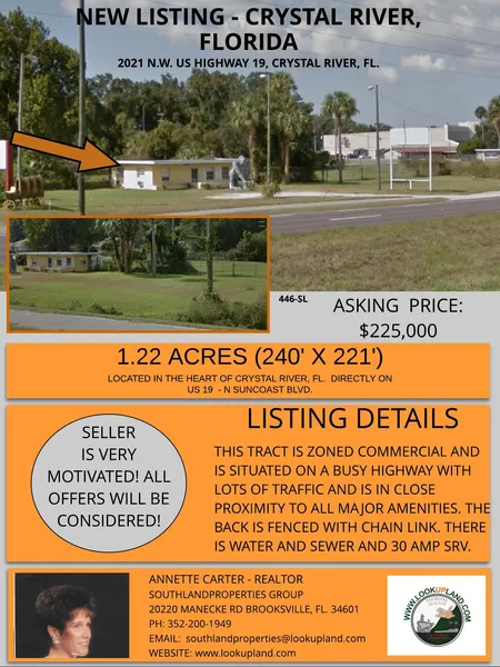 THIS TRACT IS 1.22 COMMERCIAL ACRES. IT SITS ON US HIGHWAY 19 IN CRYSTAL RIVER. DIRECTLY ACROSS FROM MARINE TOWN, A MARINE DEALERSHIP, AND NOBLES MARINE, WITH LOTS OF COMMUTING TRAFFIC. THIS PIECE HAS TWO ACCESS ROADS. THE FRONT FACES US HWY 19 AND THE BACK SITS ON NW 12TH AVE. THERE IS A SMALL CONCRETE BUILDING, BUILT IN 1969, A LANDMARK CONCRETE GORILLA, A CONCRETE PATIO (NO FOOTER) ON THE BACK SIDE, AND THE BACK OF PROPERTY IS FENCED IN WITH CHAIN LINK. THERE IS WATER AND SEWER, AND 30 AMP ELECTRIC SERVICE.