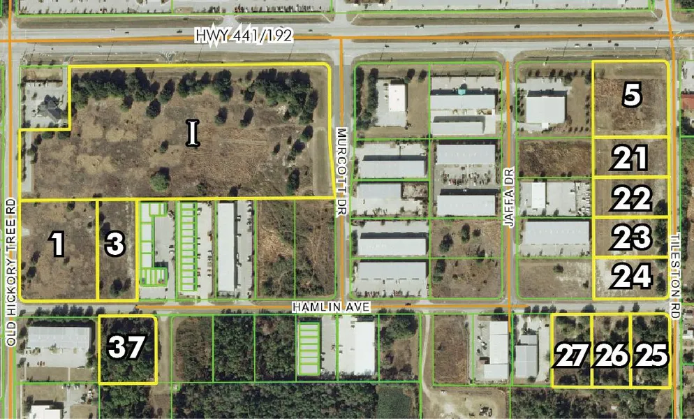Zoned commercial/industrial. St. Cloud Utilities. 100% uplands. Road frontage: 1,300 on HWY 192/441; 670 on Old Hickory Tree Road; 990 on Hamlin Avenue; 528 on Murcott Drive; 1,186 on Tileston Road.