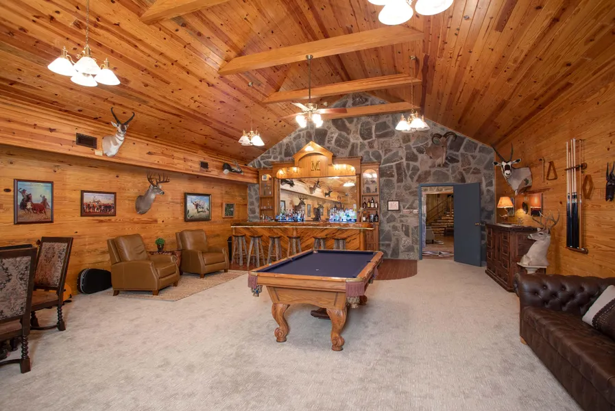 Improvements: The main home is of cut stone and log construction with an open design including Saltillo tile floors and vaulted ceilings with a native stone fireplace. According to KCAD the total main living area is 3,224 sq. ft. The interior of the house is all wood with very nice knotty pine ceilings and pecky cypress cabinets. There are 2 bedrooms and 2 baths with a loft bedroom upstairs. There is a large island kitchen with all electric appliances. There is a fantastic trophy room with pool table, huge fireplace, and a very impressive cypress wood bar that makes this area of the home fantastic for entertaining. The main home is equipped with two ac/heating units and has central air and heat and has its own septic. This ranch is being sold as a turnkey ranch with most of the furnishings conveying!