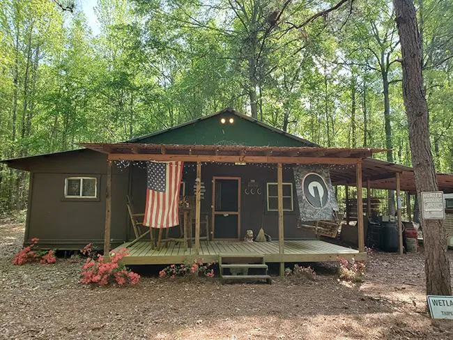This tract is a turnkey hunter's paradise. This parcel really does have everything you would want or need for a hunting retreat in that it gives you the seclusion you desire in a getaway, excellent deer and turkey hunting, long creek frontage of a year round creek, and topped off with an extremely well appointed small hunting cabin with a kitchen and bathroom. The cabin has been purpose built for this use and the attention to detail is evident. From the detailing of the mug holders to hot shower, this cabin is well done. The tract itself is approximately 95 acres mostly wooded in fully mature hardwoods. The property abounds in white oaks, water oaks, dogwoods, poplar, sycamore and cypress trees. There is also a power line easement providing and open area for excellent site lines that has some fruit trees planted for soft mast. The creek running along the rear of the tract is a year round...