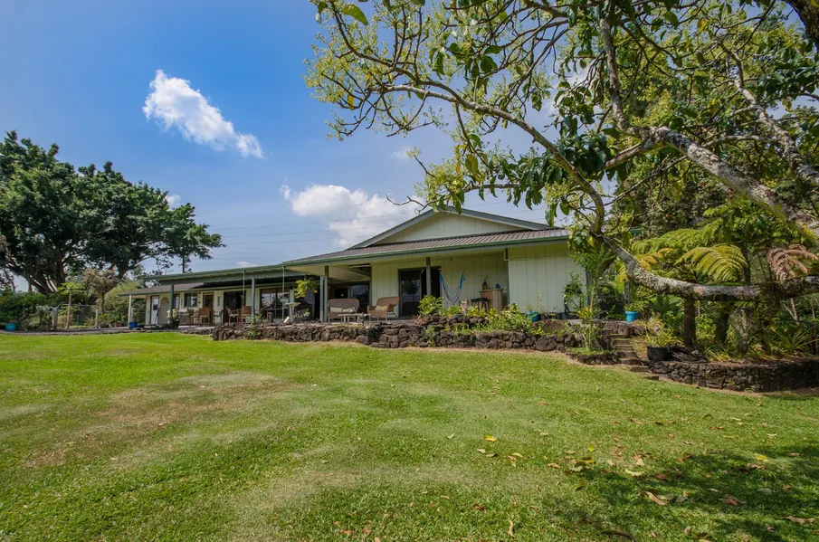 Enter this single level home through solid koa doors and be wowed first by light flooding through skylights in the vaulted ceilings onto the spectacular koa paneling and an architect-designed FireDrum 2 in the living room. Look across a sitting room and out through the sliding doors and youll find a spacious covered lanai - perfect for any weather. Beyond the lanai is an enormous rolling lawn with a view of Hilo Bay on the horizon.