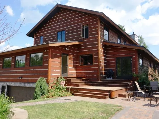 950' of peninsula shoreline on French Lake is the site of this impressive custom 4BR/5BA home. The master suite is massive w/275 sq ft featuring a 4 season room, over 200 sq ft of walk-in closets & 190 sq ft bath w/fully tiled double shower & 2 person whirlpool tub. The open concept kitchen w/quartz counters, custom cabinetry, stainless commercial grade built-in appliances & island w/prep sink, cooktop & breakfast bar is a chefs dream. Dining area, corner sitting area & LR have vaulted ceilings, wood floors, lake view windows, duel paddle fan & fieldstone see-thru gas fireplace. Take the log staircase to the upper lever to find a loft sitting are overlooking the living room w/lake views, 2 large bedrooms, full bath, & guest suite w/bath & his/hers closets. This home was built on the site of the "last resort" & the lower level holds the original bar along with a game room, bath, a huge ex...