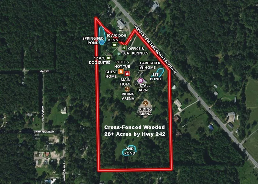 Excellent Opportunity for Potential Income-Producing Pet & Horse Boarding & Training Facility Or Commercial Development In Fast Growing Area by Hwy 242. Two Cross-Fenced Wooded Tracts Totaling 28+ Acres With ~600 Ft FM Rd Frontage. 25-Acre Tract Has 3 Homes Totaling 4773 SF, 2 Ponds, Pool, Hot Tub, 2 Riding Arenas, 1488 SF Steel 11-Stall Barn. 3.3-Acre Tract Has Dog/Cat Boarding Business With 3 A/C Buildings Totaling 7034 SqFt: 2800 SF Lodge W/12 Dog Suites; 1954 SF Cottage W/10 Dog Kennels; 2280 SF Office W/Cat Kennels; Covered Concrete Pads/Porches, Splash Pad & Spring-Fed Pond. Home Details: 3344 SF Main Home Has 3 Beds/2.5 Baths/LR/DR/Den/Kitchen/2-Car Carport; 1033 SF Guest Home Has 2 Beds/1 Bath/Den/Eat-in Kitchen/1-Car Garage; 396 SqFt Caretaker Home Has 1 Bed/1 Bath/Den/Eat-in Kitchen. Property Information Is Based Upon All 3 Homes. Barn Details: Engineered Concrete Slab, 2 Stalls (14x15), 8 Stalls (12x12), Foaling Stall, 3 Carports (20x12, 19x21 & 31x24), 3 Storage Sheds (12x20, 16x8 & 7x9), Tack Room & Feed Room With Refrigerator. Just 15 Miles From The Woodlands, Conroe, Spring & Kingwood. 10 Miles East Of I-45 & 6 Miles West Of I-69/US-59 Provides An Easy 35-Mile Commute To Downtown Houston & Texas Medical Center Or A 20-Mile Drive To Bush Airport. Also Available for Sale as Separate Tracts Separately. Perfect Opportunity For An Animal Clinic/Veterinary Hospital. Call For More Details! Buyer Purchases New Survey.
