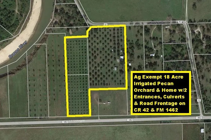 Ag Exempt! Income Producing! ~18 Acre Irrigated Pecan Orchard near FM 521, TX-288 & Proposed Grand Pkwy! Irrigated 330 Improved Variety Pecan Trees! 454 ft CR 42 Rd Frontage! 304 ft FM 1462 Rd Frontage/Culverts! 44x66 Barndominium & Attached 3-Car Garage w/HBath & 3 O/H bay doors! 36x12 Pecan Processing Center! 30x40 Equipment Barn! 16x20 A/C Fitness Center! 15x12 BBQ Gazebo w/smoker! 2 Well houses (15x20 & 9x6) w/softener & filter systems! Sprinkler systems surround buildings! Easy Access from Sugar Land via Fm 762 to Fm 1462! 2014 Taxes including Homestead/Ag Exemptions were $2802! Must See Property! Make Appointment Today for a Personal Tour! Must Be Preapproved Before Scheduling Tour of Property! *Contact Capital Farm Credit for a Loan!* Equipment Inventory Sold Separately! Equipment List, Tree Inventory Map & Surveys in Docs! View Aerial Drone Video & Pecan Processing Videos under Movie Link!