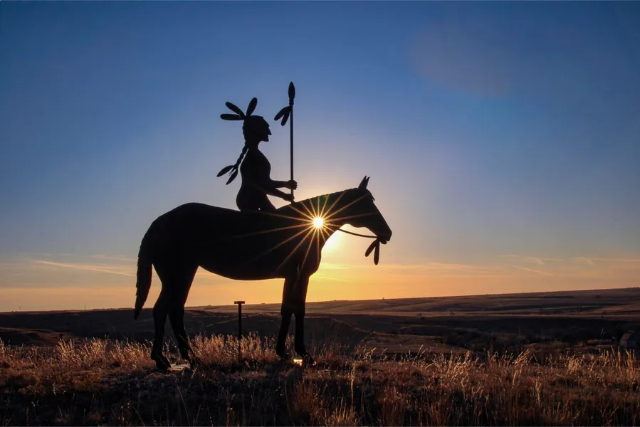 Indian Hill, recognized as one of the 8 Wonders of Ness County, is crowned by a prominent steel Indian silhouette, a familiar sight to travelers. The ranch derives its name from the hill, which, according to local lore, was the site of an Indian battle. Remnants of the battle are still visible today; ridges carved into the hillside served as trenches for the white men during the conflict, and it’s said that arrowheads and shell casings have been discovered on the summit. The hill offers breathtaking panoramic views for miles around, making it a truly remarkable vantage point.