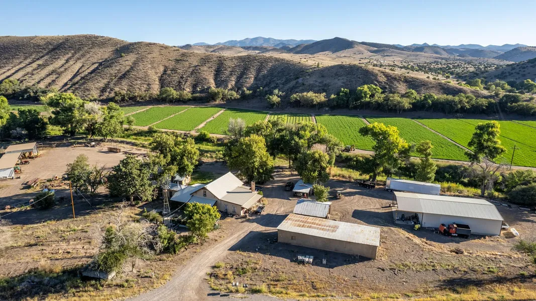 This working farm serves as the operations headquarters, featuring a historic two-story adobe home that echoes New Mexicos rich past. The property includes multiple outbuildings, such as an insulated shop, a large hay and equipment shed, a historic adobe shed with an insulated storage area, and a guest house, all designed for optimal agricultural productivity and comfort.