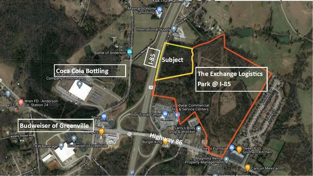 This conveniently located site is strategically situated 130 miles from Atlanta, 100 miles from Charlotte and only 1/4 mile from Exit 35 on I-85 andboasts over 900' along the I-85 frontage road with interstate visibility. This tract is adjacent to The Exchange Logistics Park at I-85 where thefirst 289000 square foot spec building is under way. Numerous other modern industrial / Distribution facilities are located within a 1 mile radiusof this site making exit 35 a prominent Upstate South Carolina Interchange. Public Water is available. Roll Back Taxes shall be theresponsibility of the buyer.