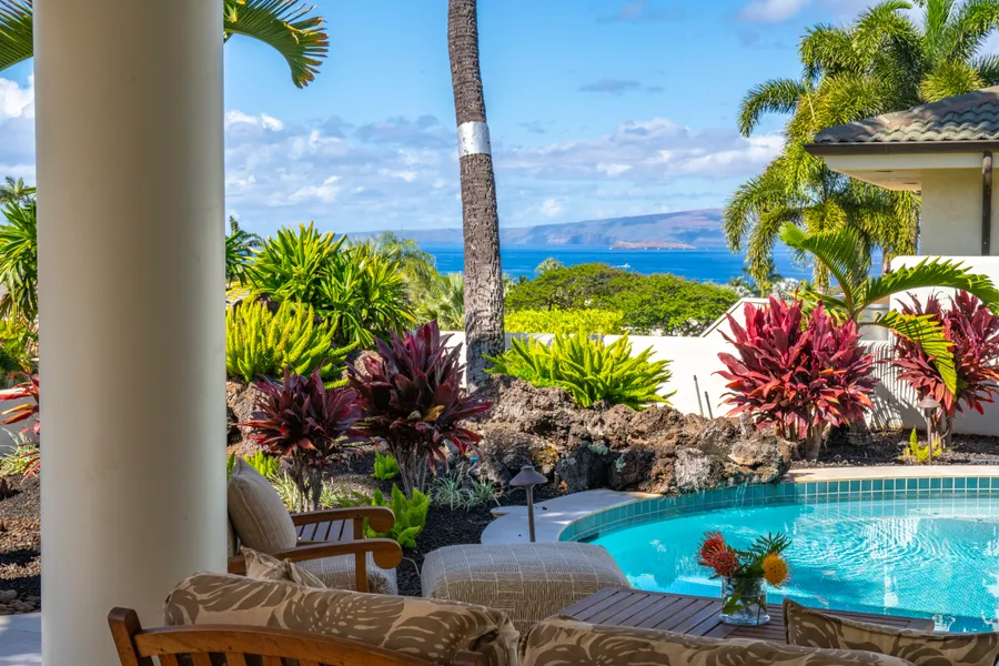 The backyard showcases a resort-style pool and spa set against the beautiful landscaping along the greenbelt creating a buffer of privacy. Soft curves, natural textures, and an intentional avoidance of harsh lines throughout the home create a calming atmosphere that complements the gentle Maui climate. Enjoy the vantage point for sunsets and stargazing, with a direct view across the greenbelt to the Pacific.