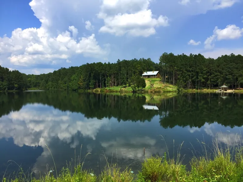 JUST REDUCED! This lake front property includes a 3 bedroom, 2 bath decorated and furnished home with separate master suite, as well as a guest camp for rollover sleeping. The home's hardwood floors, whitewashed ship-lap walls, and cedar lined closets provide a rustic feel. The main living area includes vaulted ceilings, den with slate fireplace, dining area, and kitchen with antiqued cabinets, butcher block countertops, and stainless appliances. The wraparound porch has an outdoor fireplace, shower, and fish cleaning station. Fish or boat the 30+ year old 11 acre lake with custom pier and zip line. Hunt the trophy whitetail and turkey this area is known for on 8 large food plots, most with enclosed shooting houses. The intricate road system makes it easy to get around, and most of the perimeter is fenced. Substantial timber value is provided by the 40+ year old hardwood, mature pine, an...