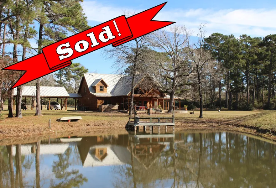James Farm Log home secluded on 40 acres midway between Lake Conroe and Lake Livingston. The two story 3,489 sf home built in 2012 has a metal roof, attached 3-car carport, and porte-cochere. A beamed cathedral ceiling, stone fireplace and wall of windows give the living room an air of rustic comfort. The island kitchen offers a gas range, dual electric/convection oven, microwave, breakfast bar, granite counter-tops. Dining area is beside the kitchen and both are open to the living room. Master bedroom is downstairs and has a door to the back porch. Master bathroom features a large tub area with natural light, twin sinks, separate shower and walk in closet. Upstairs are two bedrooms, each with a full bath en-suite. The spacious canopied back porch with outdoor kitchen overlooks the pond. 60x36 shop on a slab with power faces the concrete circle drive. The land is level with wooded areas and native pasture. Paved frontage, no flood plain, unrestricted. Cmon home to the country!