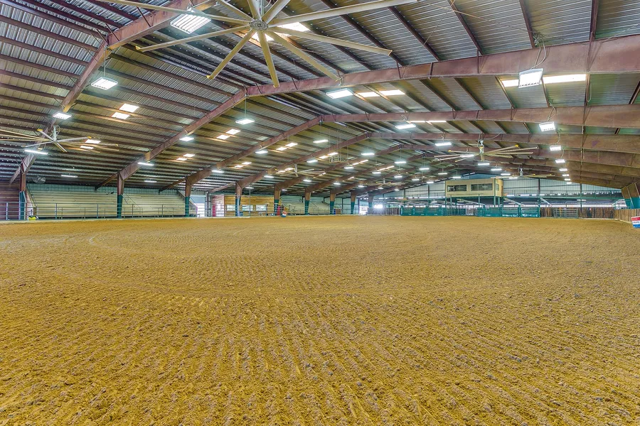The arena complex is an approximately 200 x 400 (80,000 sq. ft.) building and is of metal construction. It features a 140 x 240 arena of pipe construction. The arena has 6 Priefert bucking chutes, and Priefert roping chutes. There are two announcers stands (one on each end of the arena), multiple livestock holding pens with automatic waters, cattle load out for semi-truck or gooseneck trailers and 6 Big Ass Fans. There is stadium seating for approximately 800 people along the north side of the arena, fans over the stands and a large concession stand with commercial appliances. Both sides of the arena are concreted. There are two rows of 12 x 12 box stalls (total of 63 stalls) with concrete alley ways on the east end of the building. There are heated and cooled mens and womens restrooms with showers. Along the south side of the arena, there are nine (9) 20 x 20 box stalls with a roll up garage door in each stall and automatic waters, a large wash rack with hot and cold water, and a large tack room. On the west end of the building there is a two-story retail store space that is approximately 10,000 sq. ft., heated and cooled. It is currently used to sell saddles and tack.