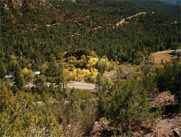 Drive about 1/4 mile North of Soda Dam and come to a road on your left called Raptor Road, take that road and you will come to a driveway where you start at an elevation of approximately 6478 ft. and end up at an elevation of approximately 6570 ft. where you have great East, South and partially West views. Views consist of Redondo to the Soda Dam to the South, Cat Mesa to the East and tent rocks to the southwest. Look down and through the Pion trees you could see some resident mule deer and elk in the Winter. Look East and you will see the Jemez River where you will fine Rainbow and German Brown Trout. Get back to the highway and head North about 4 miles and you will enter the Santa Fe National Forest where you will find more deer and elk plus turkey, grouse, bear. If you head towards the East, (and only about an half hour drive from this lot), you will come to the entrance of Valles Caldera National Preserve which recently became a National Park and within the Park you will see beautiful mountains and valleys.