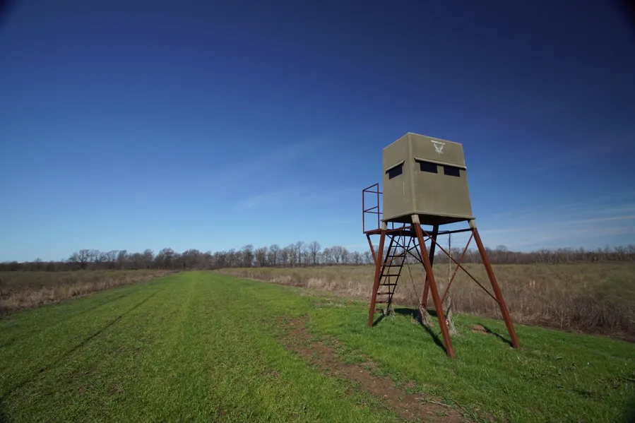 numerous shooting houses and wildlife feeders remain with the property upon sale