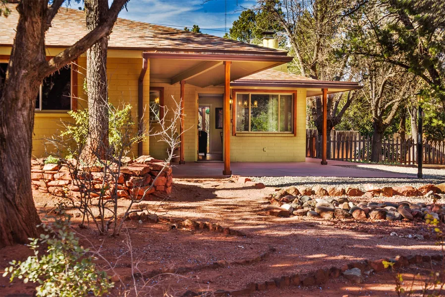 Charming, single level, move-in ready cottage on spacious .26 acre parcel conveniently located in West Sedona near grocery stores, restaurants, movie theatre. This property is presently a 5 star successful vacation rental - this 3 bedroom / 2 bath home was completely remodeled by the current owner and includes custom artistic touches by a master carpenter. It features a gourmet kitchen with stainless steel appliances, breakfast island, apron sink and butcher block counters for a cozy farmhouse feel. The living room has a stacked stone mantle gas fireplace, and the living room sliders lead to a private shaded patio where an inviting pergola offers outdoor dining surrounded by mature native evergreens under the stars. Available turn key!