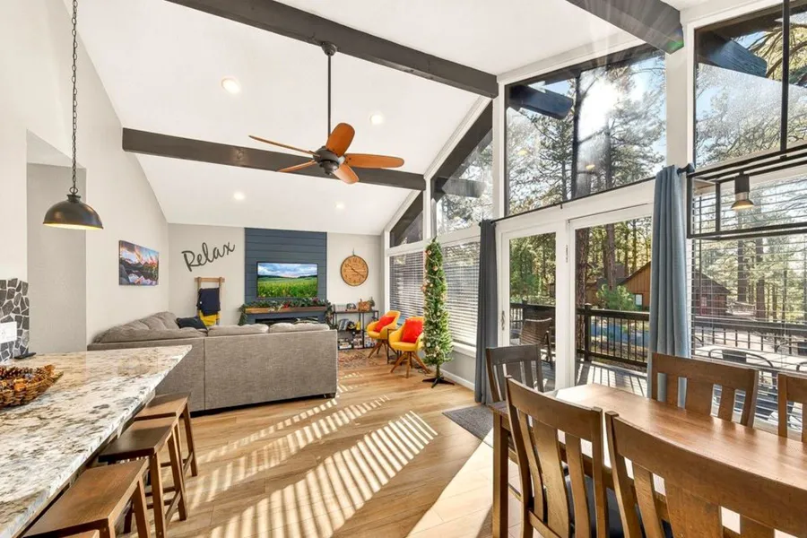 Nestled on an oversized, tree-studded cul-de-sac lot in the heart of Kachina Village, this beautifully remodeled retreat blends modern comfort with timeless mountain charm. The home features dramatic vaulted ceilings, a striking wall of windows, vinyl flooring throughout, newer roof, low-maintenance deck, fresh paint, AC, refreshed baths, & fully updated kitchen with an inviting layout ideal for cooking and entertaining. The single-level design with three bedrooms & two full baths features abundant natural light, generous parking with a circular driveway, creating an airy, welcoming environment ideal for full-time living or a second home. This property has also operated as a successful short-term rental, offering buyers a turnkey mountain getaway with a rare opportunity to own a beautifully updated home surrounded by nature, with fully furnished turnkey options available under a separate bill of sale.