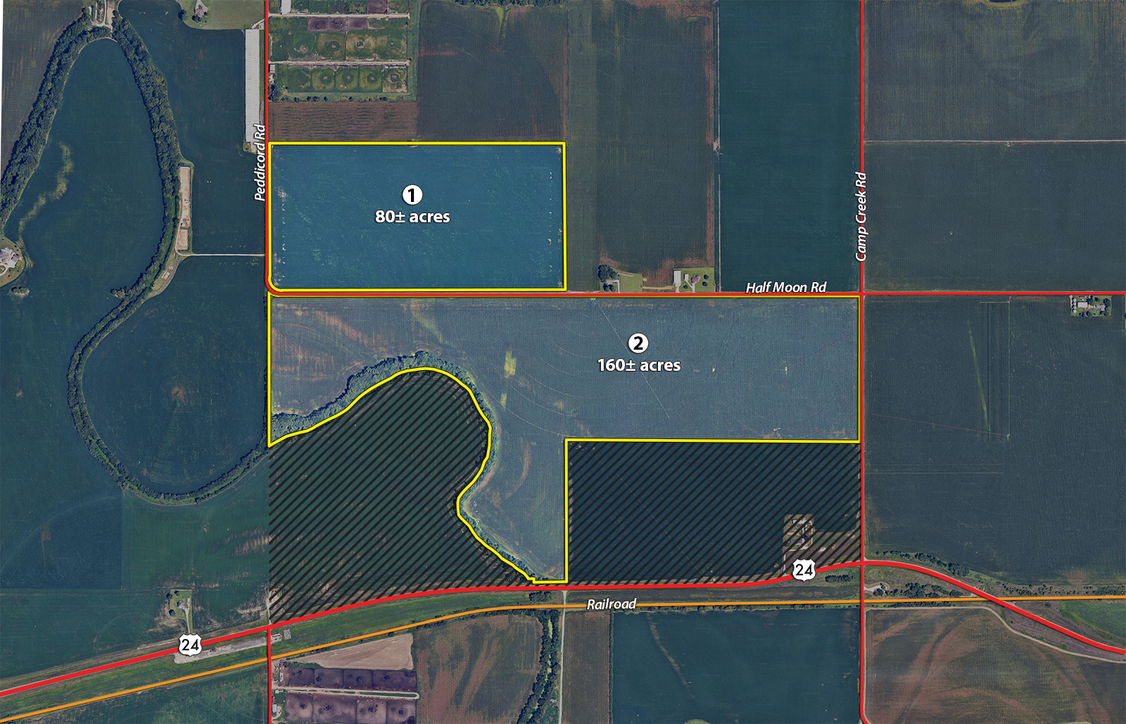 Tract 1: 80± ac with 60+/- irrigated acres located along Half Moon Rd. Primarily Rossville silt loam soils with a 7-Tower Reinke Pivot showing 2,232 Hrs. as of August 25'.
