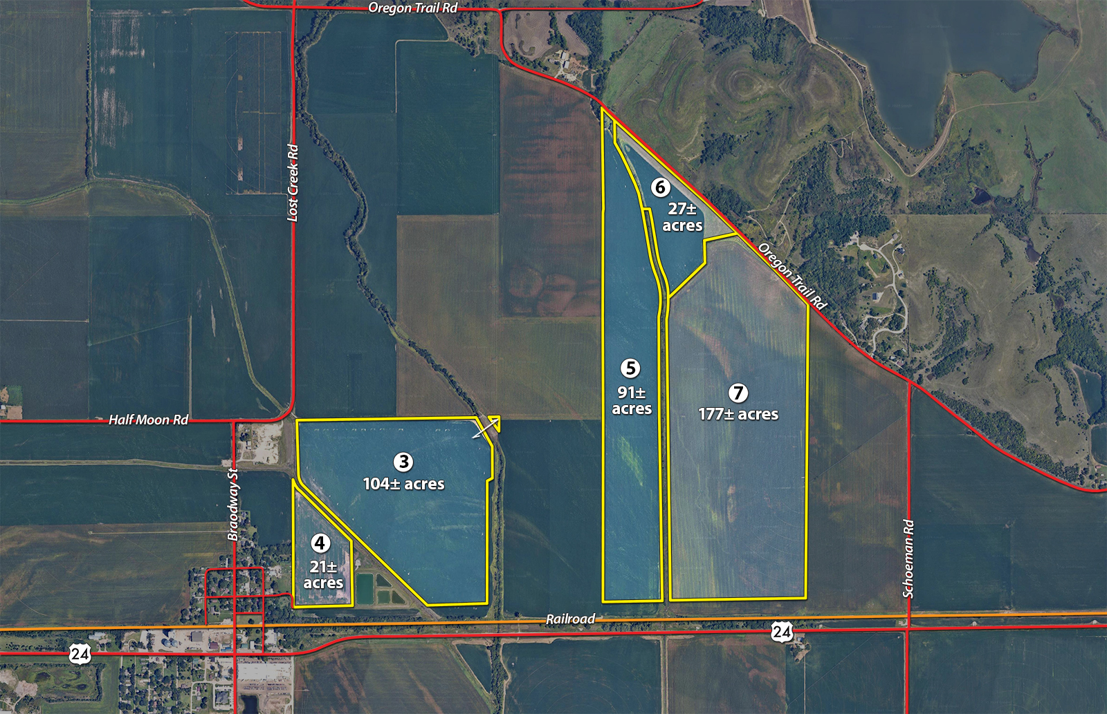 Tract 7: 177± ac along Oregon Trail Road, includes 2007 model 9-Tower Reinke Pivot showing 5,396 Hrs. as of August 25'. Approximately 90+/- acres under pivot irrigation with the balance dryland, comprised of Muscotah silty clay loam soils, bordered on the west by Welsh Creek.