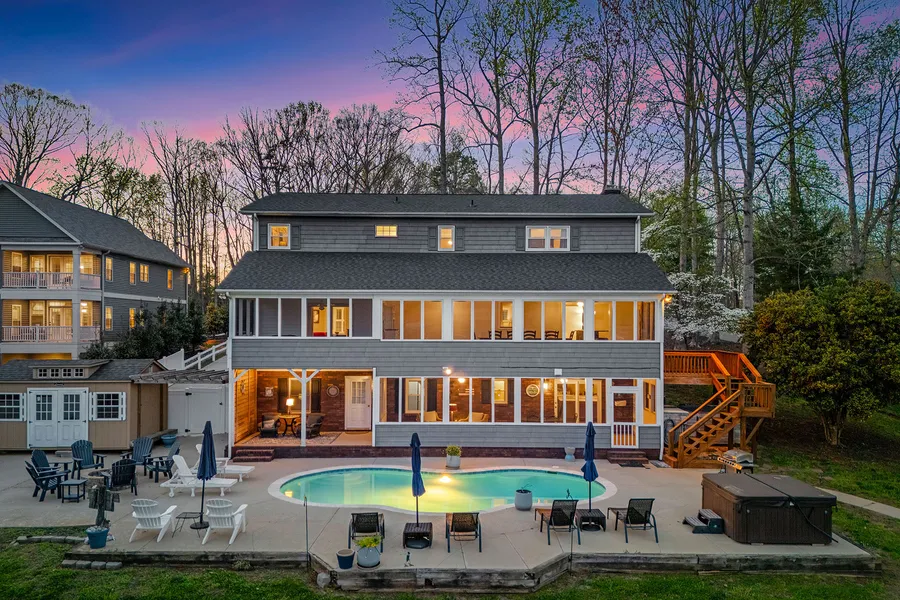 Live the Lake Norman lifestyle in this exceptional waterfront residence, nestled in a large cove with year-round deep water access. positioned on approximately 0.68 acres with no homeowner's association, this fully furnished property presents a turnkey opportunity for primary residents, investors, or a second-home retreat. Designed for effortless indoor-outdoor living, the residence features a heated pool and spa, and a tiered outdoor layout with distinct zones for entertaining and relaxation. A two-story great room with fireplace opens to a traditional kitchen with granite countertops, two islands, wood cabinetry and a tile backsplash. The expansive sunroom, currently used as a dining room, spans the rear of the home and connects to both a screened-in porch and an open-air porch with steps to the pool. The main-level primary suite overlooks the water and includes a private screened porch, oversized walk-in closet and a spa-style bath with soaking tub, dual vanity, and custom tiled shower. Upstairs are two spacious bedrooms, two full baths and a second laundry. The walkout basement, ideal for hosting, includes a second full kitchen with bar seating, recreation space, a full bath and laundry room. A three-car garage provides ample storage and convenience. The private dock accommodates boating and jet skiing, while the calm cove is ideal for paddleboarding and protects your vessel from main channel exposure. Recent upgrades include a newer roof (2023), well pump (2022), resurfaced pool deck with propane heating (2021), main level and basement HVAC (2024), and A1 Pest Control service. Located just 40 minutes from Charlotte and minutes to The Village Shoppes, Publix, Starbucks and Chick-fil-A, this residence blends lakeside serenity with urban accessibility. Seller owns neighboring property, 4478 Power Dr, that is also for sale.