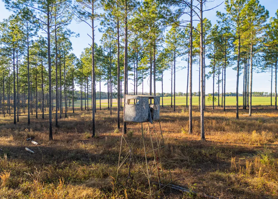 Surrounded by like-minded neighbors committed to quality deer and land management, the farm offers exceptional hunting opportunities. Whitetail deer thrive on the property, turkeys are abundant, and the diverse habitat supports excellent wing shooting. The landscape features a balanced mix of mature planted pines, productive farmland, and mast-producing hardwoods located in both upland and bottomland areas.