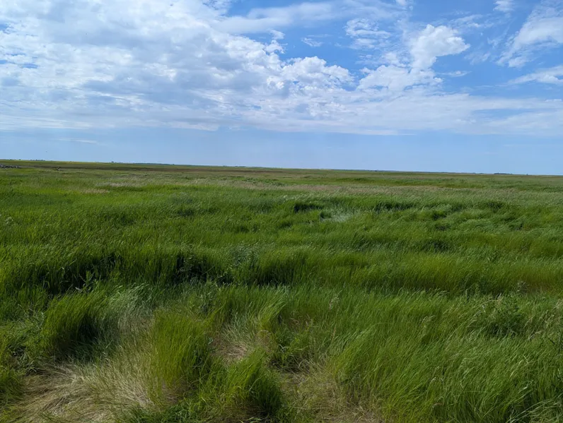 Square regularly shaped quarter section of hayland with mostly restored prairie land, western wheatgrass, and smooth brome. Surrounding land is cropped. Located in the northwestern portion is an abandoned building site (approximately 8 acres) that includes two sheds and three grain bins (Selling As-Is). Subject to Waterfowl Production Habitat by USFW.