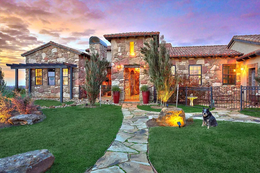 Beautiful 12+/- acre Villa overlooking the rolling hills of Whitehall, 400' elevations & views for miles! The 3,829 sq ft architecturally designed home features an open concept Great Room/Kitchen & Dining area, seamless flow & Italian flooring. The awe-inspiring Great Room features 18' reclaimed spruce ceilings and magnificent trusses fabricated from reclaimed Hand-Hewn beams. The custom floorplan and architecture maximize views and natural lighting throughout. The gourmet kitchen features ample cabinets, a 6 burner gas stove, dual fuel ovens, farmhouse sink, leathered granite countertops, breakfast booth and Butlers Pantry. The office, primary suite & bath are special with reclaimed wood flooring! 800 sq ft Casita, 800 sq ft Guest house, 4,800 sq ft barn with 4 stalls & round pen, storage & exercise area, a 4 stall 24'x36' run in barn, 2 ponds, fenced & cross fenced. 3 miles from FM 249...