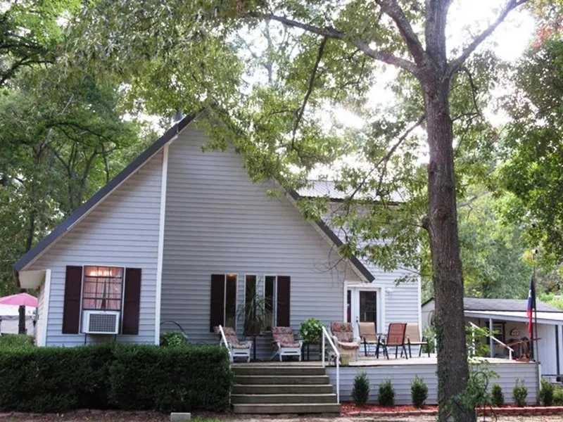 Cozy lake cabin just blocks from Lake Palestine. Enjoy the country life from the tree shaded deck of this 3 bedroom, 1 1/2 bath home with carport. Home is tucked away at the end of the street on almost an acre of land. Vinyl siding and the metal roof make for low maintenance. Expansive deck in front makes a great space for relaxing or entertaining. Inside features a living room with wood ceilings that soar 22 feet! An attractive antique wood burning stove heats most of the house in winter. The entire upstairs is the master bedroom suite with bathroom. Downstairs has one bedroom being used as an office and another bedroom - which at one time was a dining room - would make a terrific game room right off the kitchen with French doors out to deck! Low heating/cooling costs. Boat ramp is two minutes away.