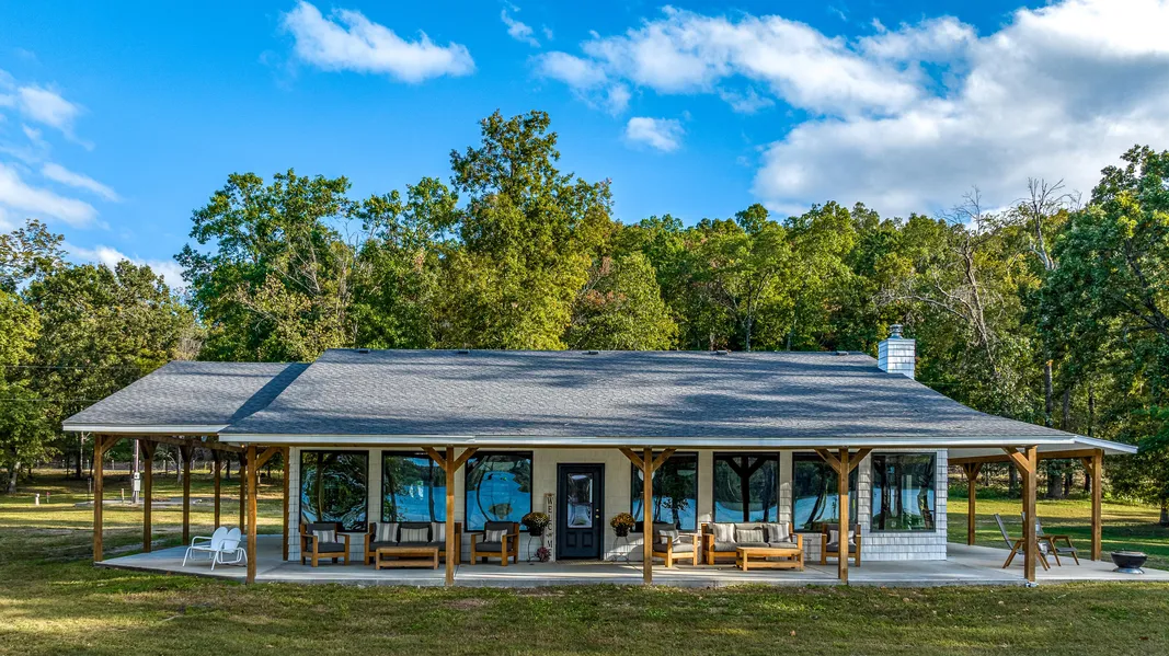 Amazing New Price Offering! Lake Dream Living of unlimited possibilities with this furnished Modern Farmhouse on 10+ acres of Waterfront Property. 1,235'+ feet (MOL) of gentle slope of shoreline on Grand Lake O' the Cherokees! Amazing enjoyment of sunsets, fishing, boating, hunting, and swimming. Enjoy 10 acres of no deed or land restrictions except GRDA rules of enjoyment. Plenty of land for a fabulous hobby farm! The wrap around covered porch is furnished with amazing outdoor furniture for hours of lake watching and sunsets! Incredible amenities of a natural creek, personal 2 slip boat dock, boat launch area, beachfront, and wildlife habitat create the most secluded and tranquil lake hideaway. Such a fabulous home designed to sleep up to 10+ with 2 bedrooms plus a sleeping loft area. Knotty pine brings all the charm with higher-end amenities of wood burning porcelain fireplace, granite, designer tile, spa inspired bathrooms & climate controlled over sized garage. Close to the Shangri La Resort & American Heartland Amusement Park. Also, if interested, this property also offers an Investment opportunity with 8 RV or Tiny Home hookup sites with utilities! Enjoy days of lake leisure and build a life you love on 10 acres framed by Grand Lake O' the Cherokees.