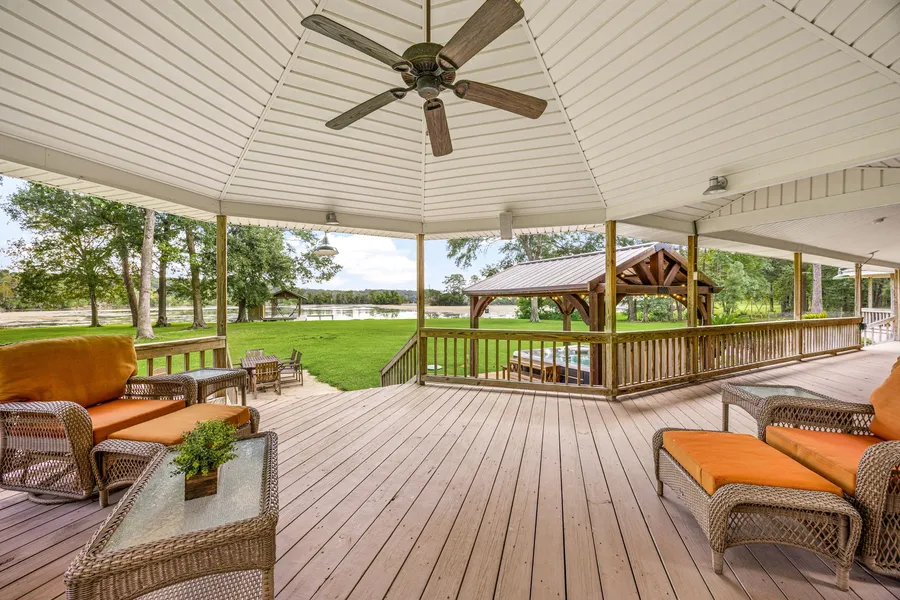 Exceptionally rare 5-acre lakefront estate offering 639 feet of shoreline with direct water access, a boathouse with lift, and a fully renovated 4,041 SF main home plus 706SF guest house. Panoramic lake views from EVERY ROOM. Drive in through the 240-ft driveway under the canopy lined with mature trees to experience a taste of the silence & peace enjoyed by the owner. The open layout includes vaulted ceilings, private views of the lake, and a chef’s kitchen with Viking cooktop, quartz countertops, and new appliances. The main level features two bedrooms w/ensuite baths; upstairs offers a game room, wet bar, media room, office, two additional bedrooms, & full bath. Outdoors you will find a wraparound porch, spa, pergola, gazebo-covered kitchen, fire pit, and flagstone paths. The private guest house, 30x30 metal barn, covered RV parking, and game-fenced garden w/greenhouse complete this property. This is truly a family estate to be enjoyed by generations to come.