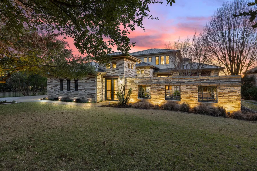 Custom built Lake Travis waterfront residence within the prestigious gated confines of The Hollows. Deep water Devils Cove with cove & main body Lake Travis views. Stunning rooftop terrace with 360 degree lake views. Natural stone and custom cabinetry on most every surface. Four bedrooms. Five and a half baths. Gated entry courtyard with Koi pond. Hand-built cantilevered stairway in entry rotunda. Primary bedroom downstairs has direct access to the pool and hot tub as well as a triple mirrored dressing area. Downstairs study w/ bath could be a 5th BR as it includes a murphy bed hidden behind its custom cabinetry. ADA compliant guest bedroom upstairs. Elevator. Poolside outdoor kitchen, interior wet bars with wine storage on both conditioned floors. A custom 260 gallon built-in double-sided aquarium divides the first floor living and dining areas. The dining room flows unobstructed to the pool terrace via a disappearing glass Fleetwood door and screen. Frameless wall of glass in living room. The light and extremely well thought out kitchen includes dual dishwashers as well as very large walk-in pantry. Adjacent the kitchen is a second downstairs office and a large utility room with copious counter space and a desk for sewing/crafts. Custom Hunter-Douglass window coverings throughout. Generous three car garage with storage. Multiple waterfalls intertwine the bridges and concrete paths that lead from the pool terrace down to the lake, all lit by custom lighting. Seven zone climate control. Fourteen zone audio. Three tankless water heaters. The Hollows community features a Beach Club with restaurant and fitness center, pickleball courts, Hilltop smokehouse with outdoor kitchen, kayak storage and over 10 miles of trails. Inquire with agent regarding marina boat slip. The two eastern contiguous lakefront lots (2.1 & 2.9 acres) may be purchased at additional cost to create a nearly seven acre compound.