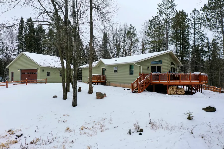 Lake view home with 3 bedrooms and 3 bathrooms positioned on +/-4 landscaped acres. Open concept design with vaulted ceilings. Kitchen with breakfast bar, oak cabinets and pantry. Living room with wood stove and patio door to rear deck. Pergola with lake views. Master bedroom with walk-in closet, double sinks and shower. Main floor laundry. Lower-level family room with bar and full bath. Detached garage with half bath. Backyard with raised garden beds and fire pit area. Beautiful views of Lake Kathryn. Enjoy fishing, swimming and waterskiing on Lake Kathryn. Located near the National Forest, local atv trails and snowmobile trail system. The refrigerator, stove, dishwasher, microwave, wood stove, pellet stove, pergola and storage shed are included in the sales price.