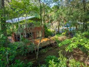 Charming, serene, lakefront sanctuary on spring fed West Lake, 4.07 wooded acres. Centrally located to St. Augustine Beach and Gainesville. Property offers a perfect blend of natural beauty and recreational opportunities, such as fishing, canoeing, & swimming. FIVE FREESTANDING BUILDINGS with screened decks and porches accommodate 6 or more residents or serve as art studios or business quarters. 4 full bathrooms, 1 outdoor shower, 2 wells, and a 16,000-gal screened-in SALTWATER POOL and HOT TUB brick paver deck. Acreage is fenced and bamboo-lined on two sides with lakefront comprising a third side. Maintained using organic principles by single owner for 45 years. A 1/2-acre organic vegetable garden, herb beds, and flowering plants thrive along with over 50 mature avocado, citrus, pomegranate, loquat, banana, guava, kiwi, persimmon and other fruit trees that dot the property. Stately Live...