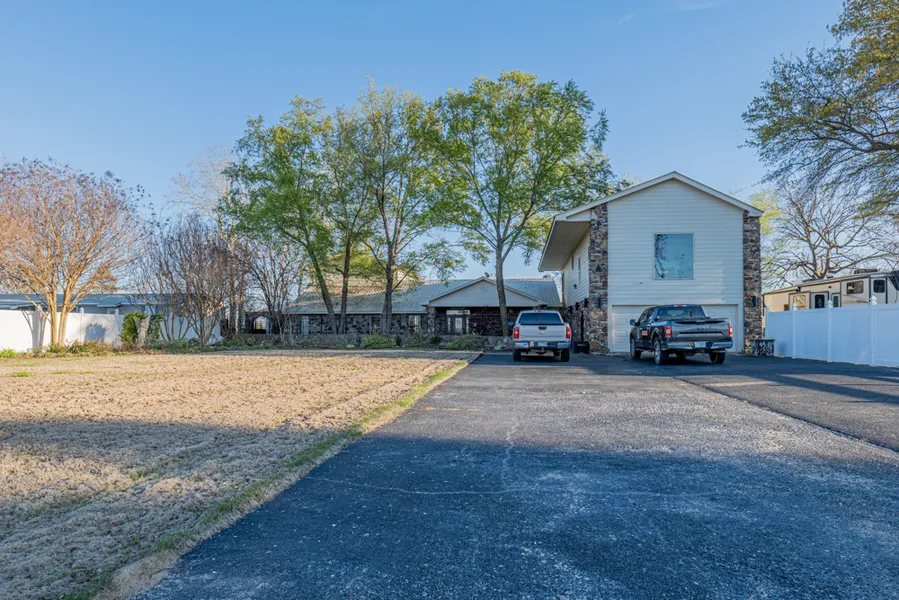 Outside, the expansive backyard is highlighted by a large swimming pool, perfect for outdoor relaxation and entertaining. Conveniently located on the double pathway to the three boat parking slip is a metal building that could easily serve as an opportunity for a high-quality bait shop or a fish cleaning station that is completely screened in with electricity and water. Additionally, the property offers a fully fenced perimeter with a gated entrance for added security and privacy. A two car garage with a loft room that could easily sleep 4 has 1 full bath and a very large 16'x18' storage room complete with floor-to-ceiling shelving, completes this exceptional lakeside retreat, providing ample space for parking and storage needs.