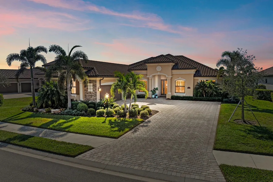 Welcome to this refined residence in the highly sought-after Lakewood National Golf Club community in Lakewood Ranch. This four-bedroom, two-and-one-half-bath home spans 2,390 interior square feet and offers a total of 3,423 square feet of exceptional living space. The thoughtfully designed floor plan includes a fourth bedroom configured as a home office, featuring custom shelving, a Queen Murphy bed and privacy French doors. The primary suite presents tray ceilings, designer finishes and new carpeting, while the main living areas are enhanced by upgraded plank tile flooring and designer wallpaper with a coastal paint theme. A spacious kitchen serves as the home's centerpiece with expansive counter space, a breakfast nook, natural gas for cooking, and stainless-steel appliances. The adjoining dining room and living room feature tray ceilings and crown molding, complemented by upgraded li...