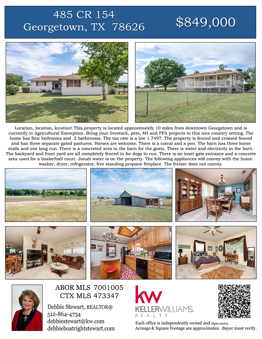 Location, Location, Location. This property is located approximately 10 miles from downtown Georgetown and is currently in Agricultural Exemption. Bring your livestock, pets, 4H and FFA projects to this nice country setting. The home has four bedrooms and 2 bathrooms. The tax rate is a low 1.7497. The property is fenced and crossed fenced and has three separate gated pastures. This is for rotating animals and control grazing. Horses are welcome. There is a corral and a pen. The barn has three horse stalls and one long run. There is a concreted area in the barn for the goats. There is water and electricity in the barn. There is a concrete and steel pipe wash rack outside for the horses/livestock. The backyard and front yard are all completely fenced in for dogs to run. Dogs cannot get out or in. There is an inset gate entrance and a concrete area used for a basketball court. Jonah water is on the property. There is a well but it needs a new pump. This is your chance to acquire a little piece of heaven in the country. Nice and quiet place to come to at end of busy work days. The following appliances will convey with the home: washer, dryer, refrigerator, free standing propane fireplace. The freezer does not convey. Seller will need at least a 30 day lease back.