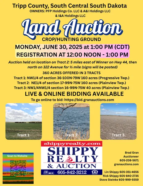 Tract 2 & 3: Go 5 miles east of Winner, SD on Hwy 44 then turn north on 322 Ave for 1/2 mile to auction locaction.
