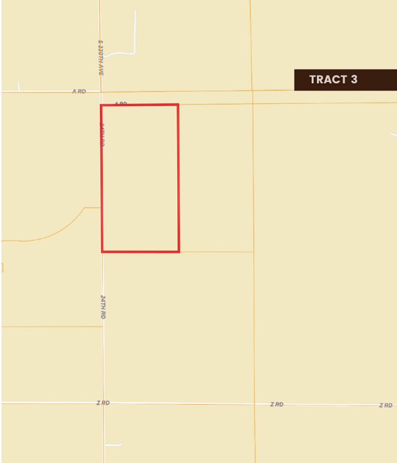 Tract 3: Go west of Clarks to 24 Rd. Turn north and go roughly 5 miles to Z Rd. Keep going north 1/2 mile. The property is located on the east side of the road.