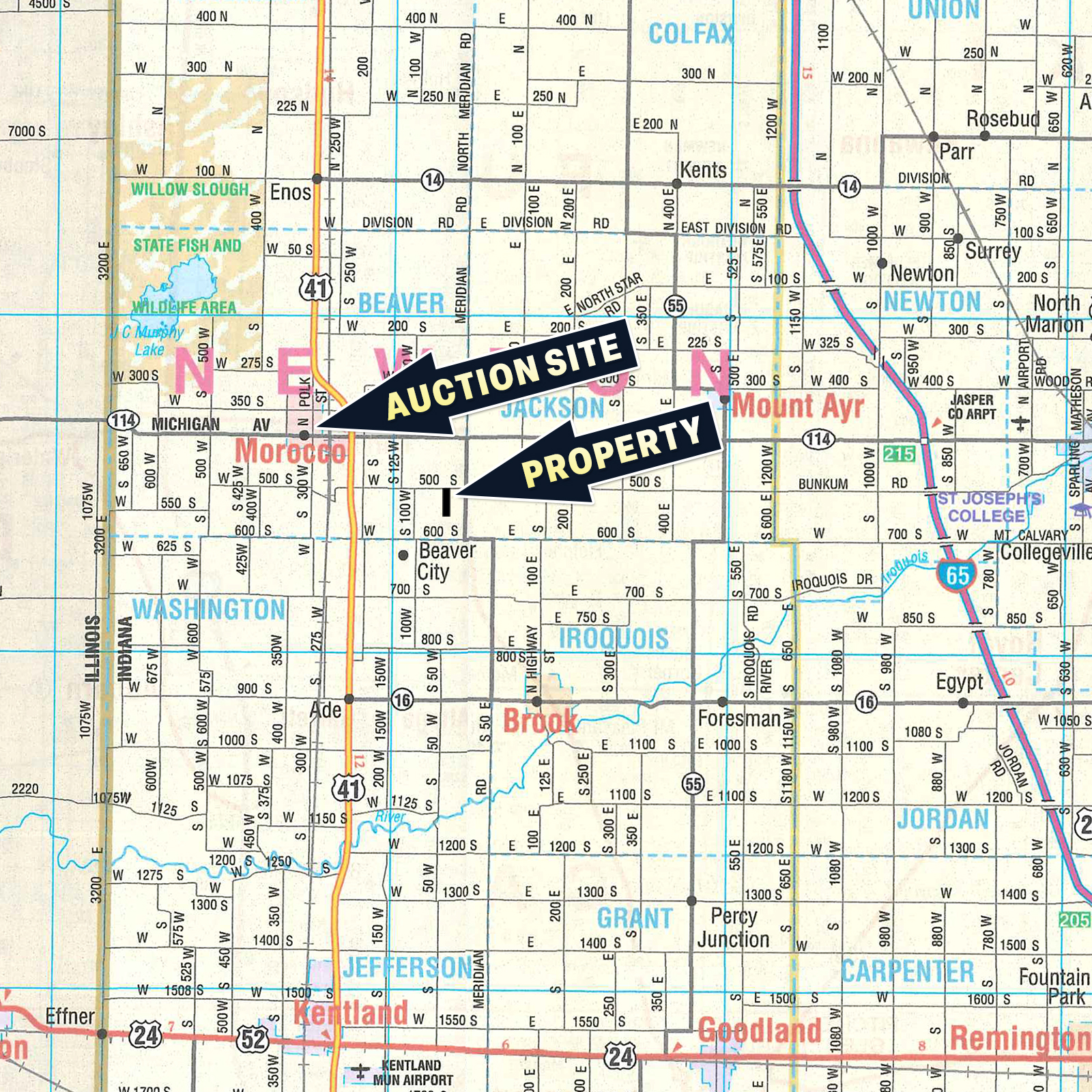From East of Morocco at the junction of US 41 & SR 114, go West on Michigan (CR 400 S) approx. 3/4mi. to Polk St. Turn North on Polk St, & travel 1/8 mi. to auction site on your right. The Beaver Township Community Center adjoins the Fire Station.