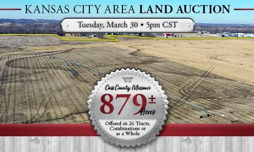 879+/- Acres in 26 Tracts in Combinations or as a whole Tracts Ranging from 5+/- to 167+/- Acres 30 Miles South of Kansas City, Missouri High Percentage Tillable Acres Irrigated Cropland 160,000 Bushel Grain Bin Set-Up Being Offered Separately Several Improvements Including 16,800 Sq. Ft. Shop 5 House Tracts Wooded Recreational Land Online Bidding Available FARM EQUIPMENT TO SELL MARCH 31ST!