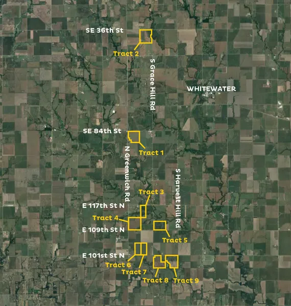 9 Tract Land Auction! Offering 1,078.96 acres in Sedgwick County, KS, and Harvey County, KS, this land auction features highly productive cropland with quality soils, as well as prime home site and hunting opportunities. The auction will take place on Saturday, November 23rd, at 9:30 AM, with both live and online bidding available. The event will be held at 1551 N. Waterfront Pkwy, Wichita, KS 67206 (Commerce Bank Building). The sellers mineral interests will transfer with the real estate, and FSA and tenant information is available upon request. This auction consists of 9 tracts. Tracts 1 through 5 will be offered individually in numerical order, while tracts 6 through 9 will be offered by choice. The high bidder will get to choose which tract(s) they want to purchase from tracts 6 through 9. Rounds of bidding will continue until all tracts 6 through 9 are spoken for. Please note, we wi...