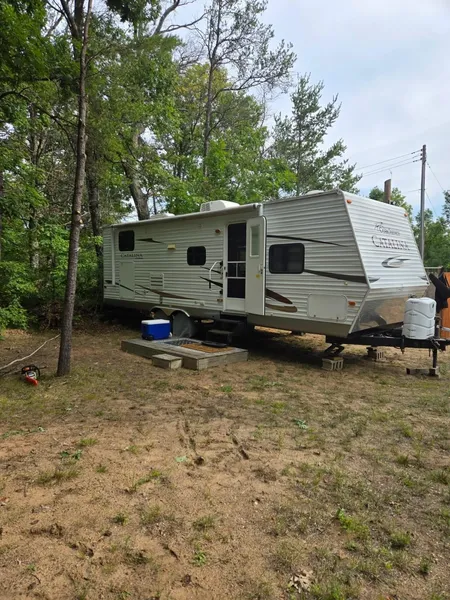 Camp ready with 2 travel trailers 27' 2011 Coachman and 28' 2016 Coleman. On site is a shower shed with 5'' well and electric service. The parcel is also set up for an additional trailer.