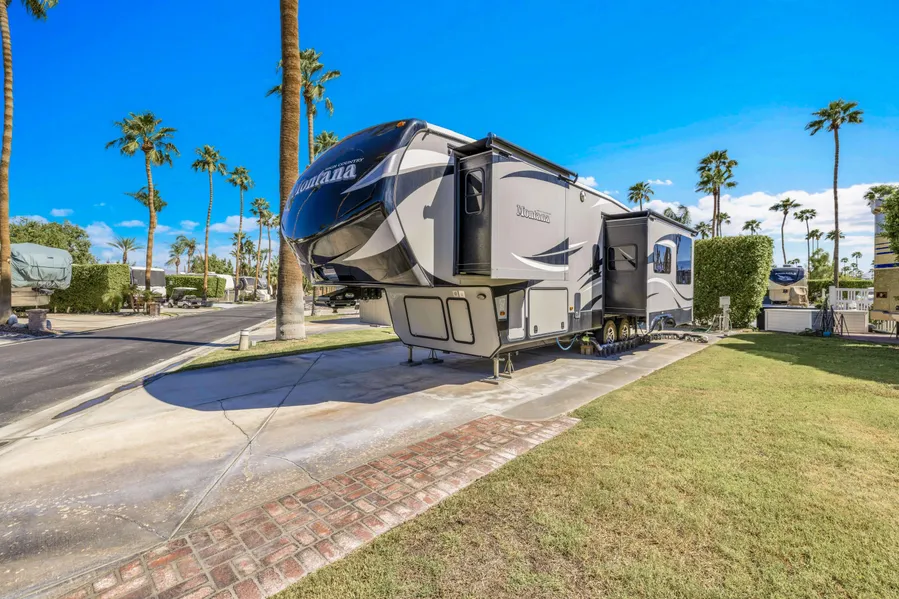What's great about this lot? Its a terrific corner lot located across from the pool and spa. Capture gorgeous San Jacinto mountain views from the lot and also from interior of rv. Easy carefree low maintenance lot. Laundry and full restroom facilities also just steps away. Located adjacent to a greenbelt so no neighbor directly to the right. Private location and such a great price for the location and a corner lot.