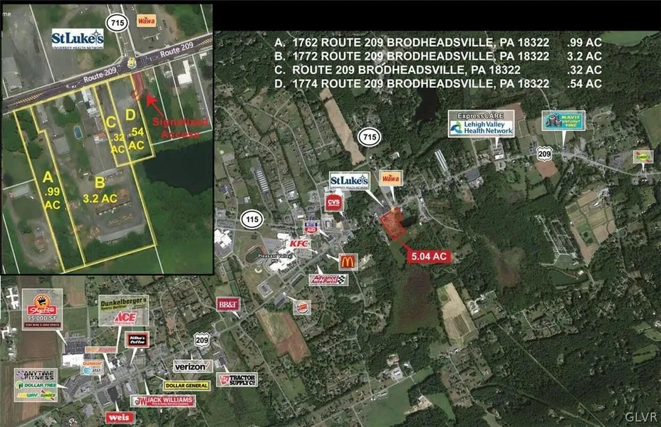 Property is four parcels (1762-1774 Route 209 in Brodheadsville), +/- 5 Acres and is situated at signalized intersection of Rt. 209 and Rt. 715. Traffic counts in excess of 18,000 VPD.