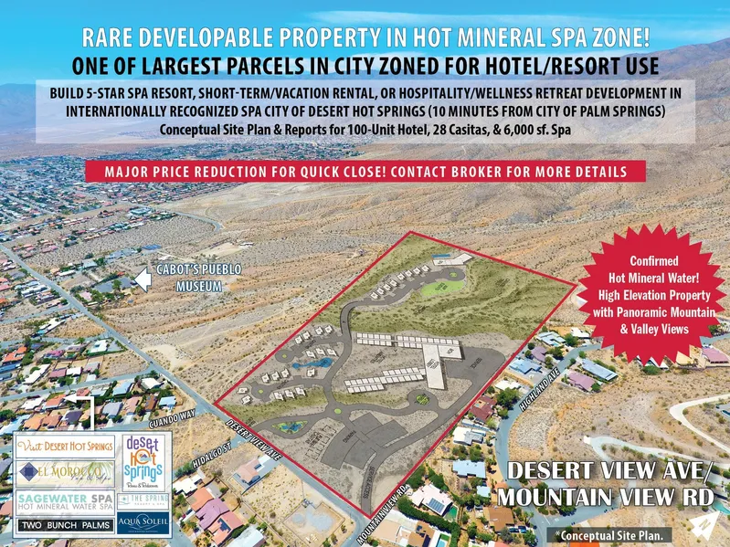 MAJOR $700k PRICE REDUCTION FOR QUICK ALL CASH CLOSE! NOW WHOLESALE PRICED! SELLER SAYS SELL IMMEDIATELY! 'DESERT VIEW/MOUNTAIN VIEW 20-ACRE HOT WATER RESORT' is a prime developable land property with hotel zoning (zoned 'VS' - Hotel/Hot Water Resort) in the city; and is also within the Hot Mineral Springs Zone with an existing hot water well (194 degree water). The property is located in the most desirable area of Desert Hot Springs and has spectacular views of the surrounding adjacent hills & Mt. San Jacinto. This irreplaceable property sets itself apart from the competition, and offers a peaceful and tranquil setting for a one-of-a-kind hot water resort. Attractions nearby include Cabot's Pueblo Museum, and spectacular hiking trails nearby and not far in Joshua Tree, and with only a 10-minute drive to Palm Springs. Potential buyers/developers should also consult with the city of Desert Hot Springs to see whether the city will apply the benefits of its Spa Revitalization Program to new construction. The Spa Revitalization Program allows operational spa properties that undergo renovations to apply to have 100% of the net increase in monthly transient occupancy tax waived for up to two years.