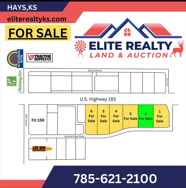 Searching for a site to fit your next or first business endeavor? Do not look past this opportunity to own acreage right along Hwy 183 just 1+\- mile North of where Hwy 183 meets Interstate 70 and Hays’ primary commercial retail area. 6 lots are available ranging from 2.5-2.9 Acres in size. General Hays Rd to the East offers off-highway accessibility while this property still allows you to reap the benefits of the Hwy visibility. Contact Nathan Goetz at 785-672-3246 or Mark Ottley at 785-623-1400 today for more details!!!!