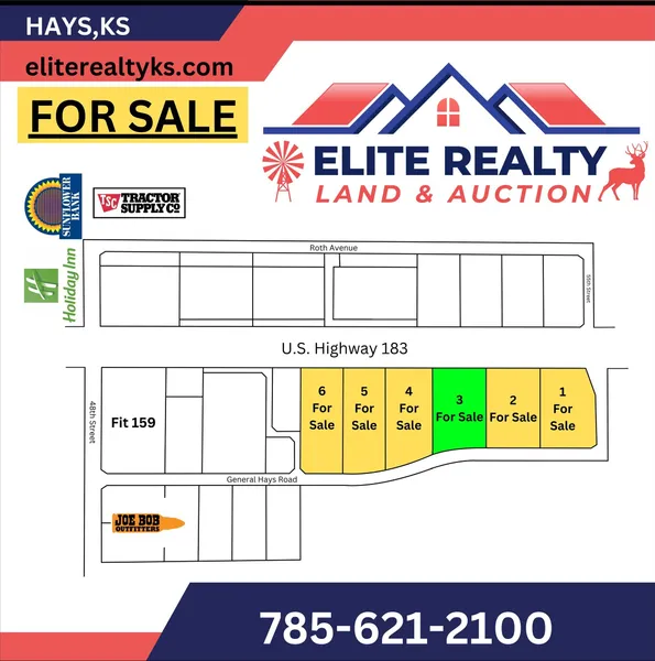 Searching for a site to fit your next or first business endeavor? Do not look past this opportunity to own acreage right along Hwy 183 just 1+\~ mile North of where Hwy 183 meets Interstate 70 and Hays’ primary commercial retail area. 6 lots are available ranging from 2.5~2.9 Acres in size. General Hays Rd to the East offers off~highway accessibility while this property still allows you to reap the benefits of the Hwy visibility. Contact Nathan Goetz at 785~672~3246 or Mark Ottley at 785~623~1400 today for more details!!!!